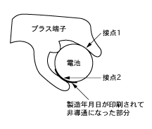 ボタン型電池の側面はプラス側の電極であるが、製造年月日が非導通の不滅インクで印刷されている。電極との接触点が1ケ所だと、接触点と印刷位置とが一致したとき導通しなくなるので、接触点を図のように2ケ所とるのが好ましい。印刷部分を検知して接点を動かすような凝ったことをするとコストが高くなる。この時は、本例のような単純な冗長設計が役に立つ。