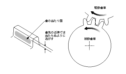 歯車のかみあい騒音が大きかった。そこで図のように、歯当たりを歯先の近傍では逃がすように、歯の当たり面を修正して、騒音を低下させた。