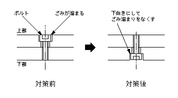 【設計のアドバイス】 半導体関連の生産現場は、環境の清浄度を確保することが重要である。クリーンルームの内部で使用する機械は、機械自体からのごみの発生を抑えることや、ごみが1ヶ所に溜まらないようにすることが必要である。ボルトは極力下側から挿入する構造にするが、上向きにせざるを得ない場合は、カバーなどを付ける。