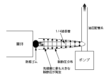 図のように、1/4波長管内の脈動圧の分布は、先端部分で最大となる。したがって、この先端部を車体に固定する場合は、防振ゴムを介して取付ける必要がある。なお、1/4波長管とは、つぎの性質を利用したものである。油圧配管系から1/4波長管へ入った脈動は端部で反射し、再び油圧配管系へ戻る。そのとき、1/4波長管を脈動波長の1/4の長さに設定しておくと、入射波と反射波は逆位相となり、干渉を起こし脈動を低減する。