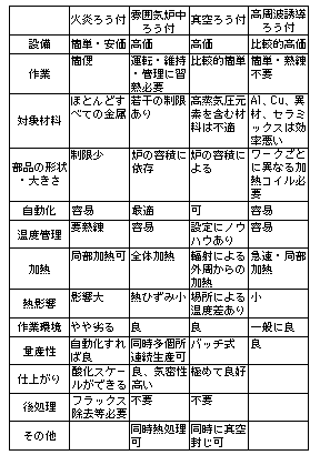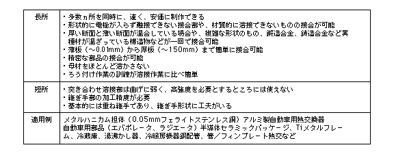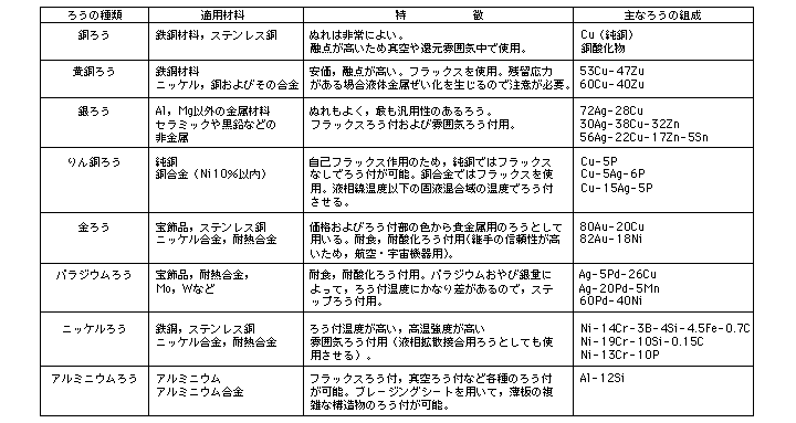 ろう付けは、精密な部品の接合が可能で、大量処理でき、材料の制限が少ない、などの利点があり、自動車部品、航空機部品、家庭用電器部品などに多く使われている。溶接と異なり、母材を溶かさないのが特徴である。表1に、溶融溶接と比べた時の、ろう付けの特徴と適用例を示す。ろう材は接合する金属によって選ぶが、その特徴とろう材の組成を表2に示す。また、ろう付け方法も表3のように、各種の方法がある。継手形状は、ろう付けしやすく検査が簡単な形状として、重ね継手が多く使われる。突合せ継手も使われるが、高強度が必要なところには適しない。図1に、代表的な継手形状を示す。なお、異種金属の接合には、図2のような、トランシジョン・ジョイント(異材接合継手)を用いる。(参考文献:「接合・溶接技術Q&A1000」産業技術サービスセンター、「新版 接合技術便覧」産業技術サービスセンター)