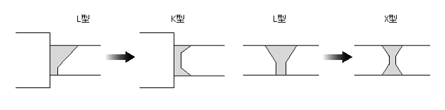 開先溶接で、L型やV型は溶接量が多いので、K型やX型に変更すると、溶接コストの低減が図れる。ただし、両面から溶接できることが前提である。