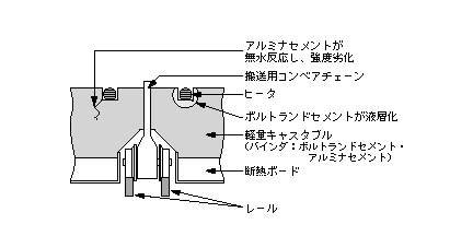 溶解炉の炉内搬送コンベアを設計した。軽量化のためにハウジングを、嵩(かさ)比重が0.5程度と軽いバーミキュライト質のキャスタブルを選定した。バーミキュライトとは雲母系の原鉱石を高熱で焼成・膨張させた人工用土である。つまり、この骨材の中に“糊(のり)”代わりにセメントをバインダとして混合したキャスタブル耐火材を選定した。ところが、ヒータ支持部分でバインダとして用いたセメント、すなわちカルシウムシリケート(CaO・SiO2)系の、建築・土木用として最もポピュラーな、ボルトランドセメントが液相化した。その結果、強度が著しく低下し、ハウジングが破壊され、最後は、コンベア自体が崩壊した。