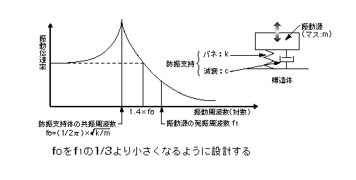 振動源の支持部弾性ゴムのバネ定数を決める場合、振動源をマスと考えた時の共振周波数を、振動源が発振する周波数の1/3以下となるように設定する。そうすると、構造体に伝達される力(振動)は大幅に軽減する。