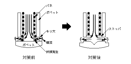 チェック弁内部のバネが折損した。図のように、ポペット内にバネが設けられており、流体はバネのすきまを通り、キリ穴から流れる構造であった。ポペットに大流量が流れるとき、流体の流れがバネで絞られたため、ポペットの内圧が高くなり、バネがキリ穴に押し付けられて折損した。