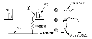 図のようなECL回路で、電源層の回路を動作して電流を切替えたところ、信号回路が誤動作した。終端電源層のインピーダンスが高かったため、許容値以上の電源ノイズが発生し、終端抵抗を介して信号ラインBに重畳した。このノイズが回路のいき値を超え、出力Cにグリッジノイズが発生した。なおECLはEmitter Couple Logic の略でデジタル論理回路の一つである。