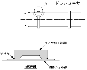 円筒構造物の溶接部に亀裂が発生した。図1のように、タイヤ部と胴体シェル部が、全周溶接されていた。タイヤ部に加わる外力で、断面変化が大きい溶接部に応力が集中した。対策として、図2のように、タイヤ部と胴体を一体構造とし、溶接部をR部から離れた位置に変更した。