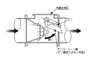 密閉された設備の中で、定期的点検や部品交換を行う場合、交換部品以外の周辺機器を取り外さないような作業方法が好ましい。図1で、ダンパーコーン部品は、摩耗によって定期的に交換するが、交換の際、ピン抜き作業で作業時間がかかる。そこで、図2のように、ダンパーとコーン部とを分離し、使用時はボルト結合しておくが、交換時はをコーン部(実際は円板状)のみをはずし、交換作業の容易化を図った。
