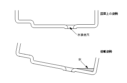 車両の排気ガスに白煙が見られた。燃料中に水分が混入したと考えて、燃料タンクを調査したところ、図のように、タンクの底部に水抜き穴があるが、タンクが斜めに取付けられ、水抜きしても底部に水が残ってしまうことが判明した。設計時、図面上の姿勢で水抜き穴の位置を決めたことが原因であった。対策として、水抜き穴の位置を斜めにした時の最下部へ変更した。