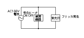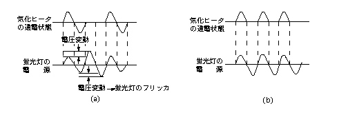 暖房機器の定常運転で蛍光灯のフリッカ現象(蛍光灯の照度がちらちらする現象)が発生した。配線は図1に示すとおりで、この時、特に50kHz地域では、配線が長く電圧降下の大きい蛍光灯が顕著に多かった。暖房の気化ヒータの電力は定常運転時225Wに落とすが(暖房開始時は450W)、この制御を、図2の(a)のように、電源周波数の1波おきに通電したため、蛍光灯の電源電圧変動(25回/sec)が発生した。対策として、図2の(b)のように、半波による通電に変更した。