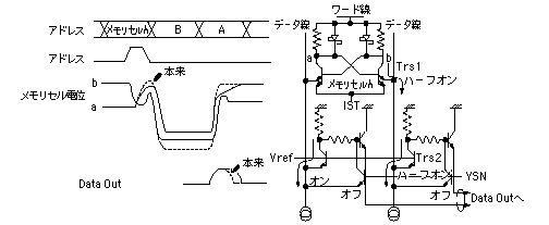 メモリLSIの評価を完了し、装置に搭載したところ、アクセスタイム不良が発生した。調査したところ、図のように、書き込みパルス位相に対して、メモリセル電位が十分に立ち上がらず、データが遅れて出力される異常が生じていることがわかった。LSIの単体テストにおいて、使用する装置のタイミングを考慮したチェックを行うべきであった。