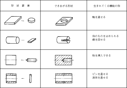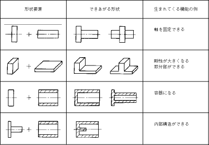 直方体、円柱、板などの基本形状を足し合わせたり、引いたりすることで、新たな形状が作られる。その結果、新たな機能が付加されることが多い。加算と減算の他にも、2つの部品の位置関係を入れ替えたり、部分的に幾何形状を変化させることも有効である。