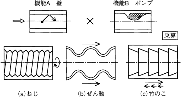 パイプの中にドロッとした液体を通す機構を考えてみる。パイプの端から押しても引いてもうまく流れないとする。この時は、図に示すように、パイプは流路の内壁であるという液体隔離の機能Aに、パイプがポンプであるというアクチュエータの機能Bを掛けてやる。すると(a)パイプ内壁にめねじを切っておき、パイプが回転すると摩擦で液体が引きずられるようにするか、(b)パイプ自身の材質を柔らかくして腸のようにぜん動運動させるか、(c)パイプの内面に“竹の子”状に斜面を切り、液体のダイラタンシー(ずり速度が大きくなると抵抗が大きくなる性質)を利用して、前後動の速度を変えて液体を送るとか、などが考えられる。(参考文献:中尾政之、畑村洋太郎、服部和隆「設計のナレッジマネジメント」日刊工業新聞社)